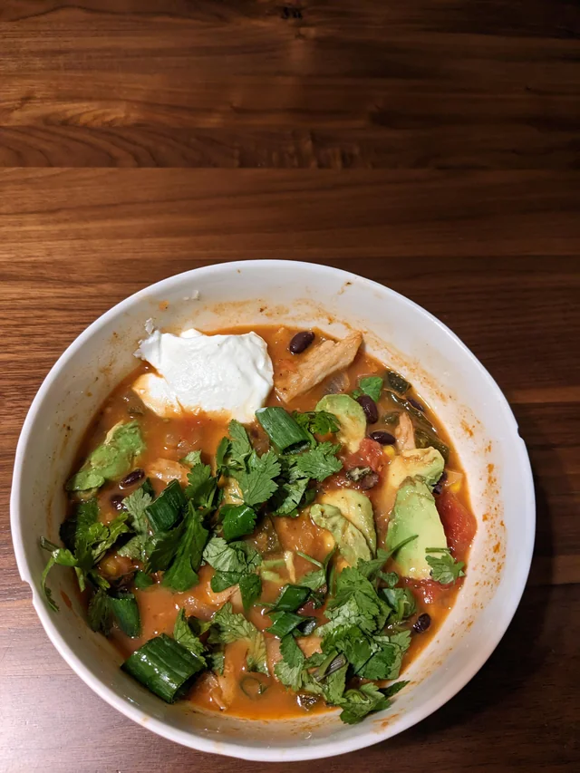 5. Serve: Ladle into bowls, top with shredded cheese, cilantro, avocado slices, and crispy tortilla chips.